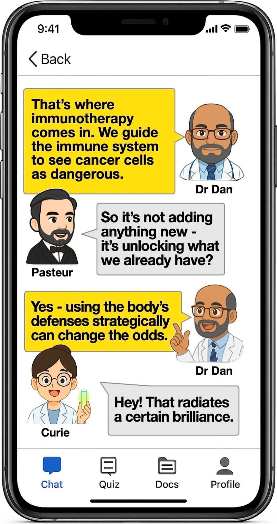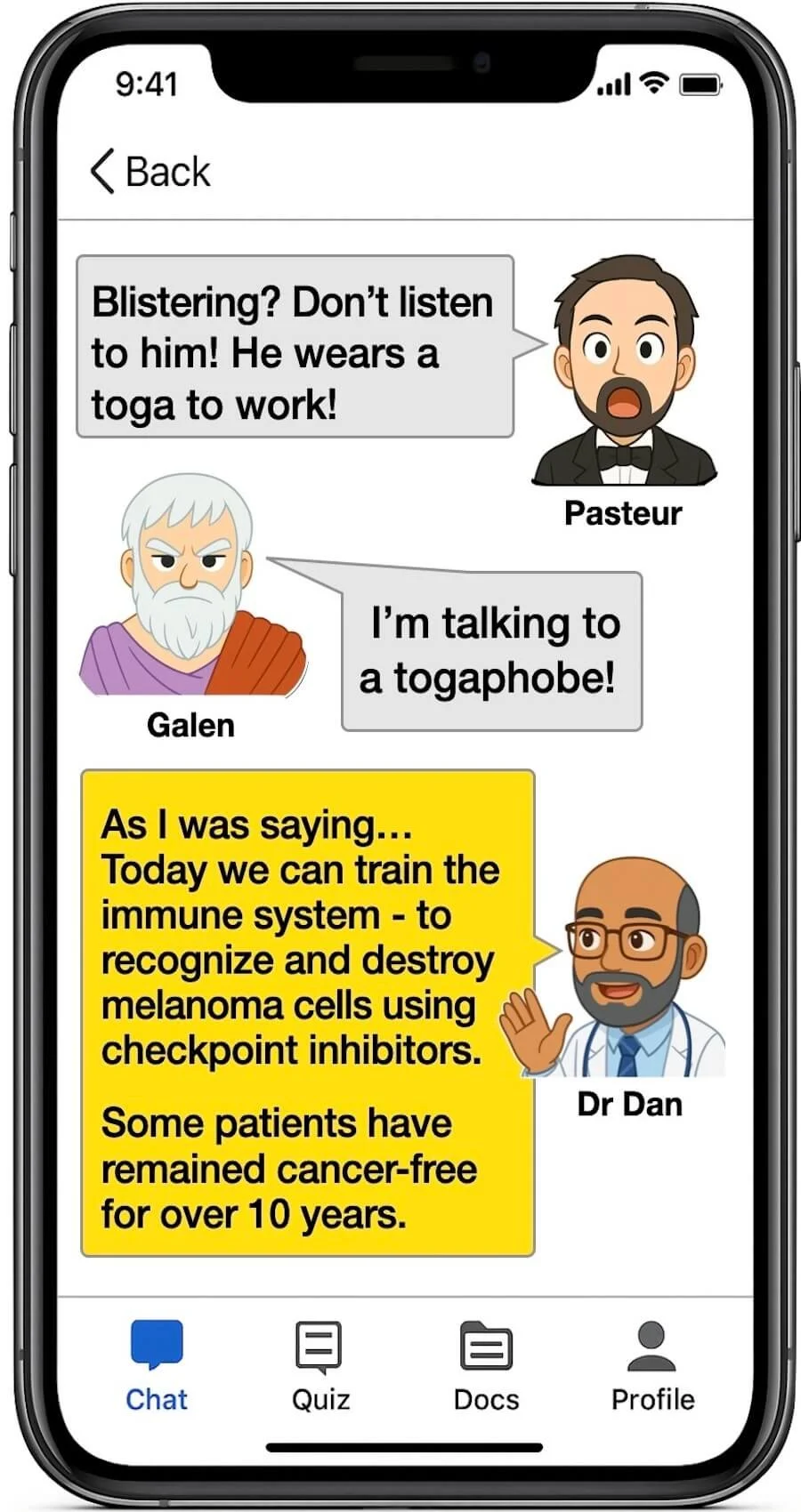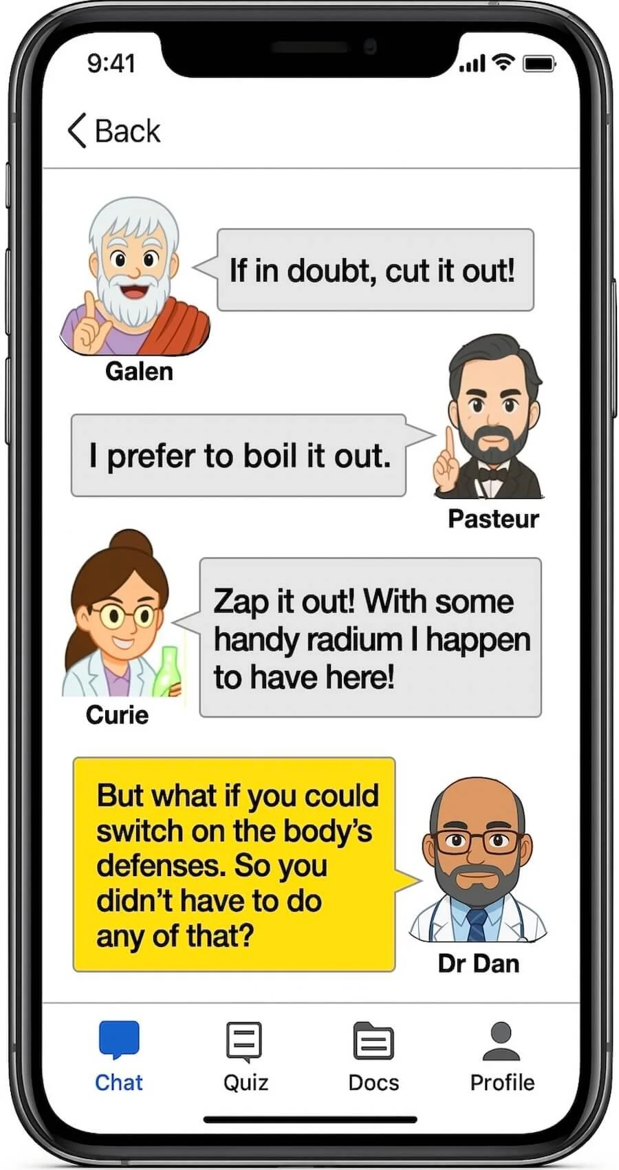 The Solution: By using humor, character psychology, and debate, the app reframes immunotherapy as the logical evolution of medicine — not a radical leap. Instead of lecturing, it invites doctors into a conversation with the experts of the past… and shows why today’s tools are better.