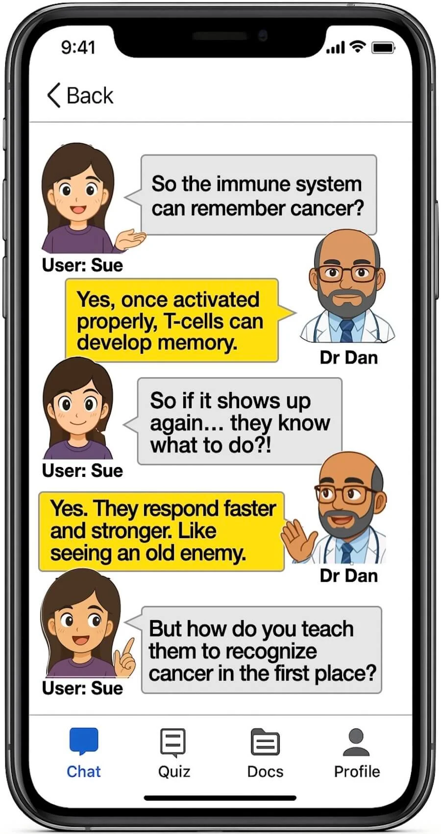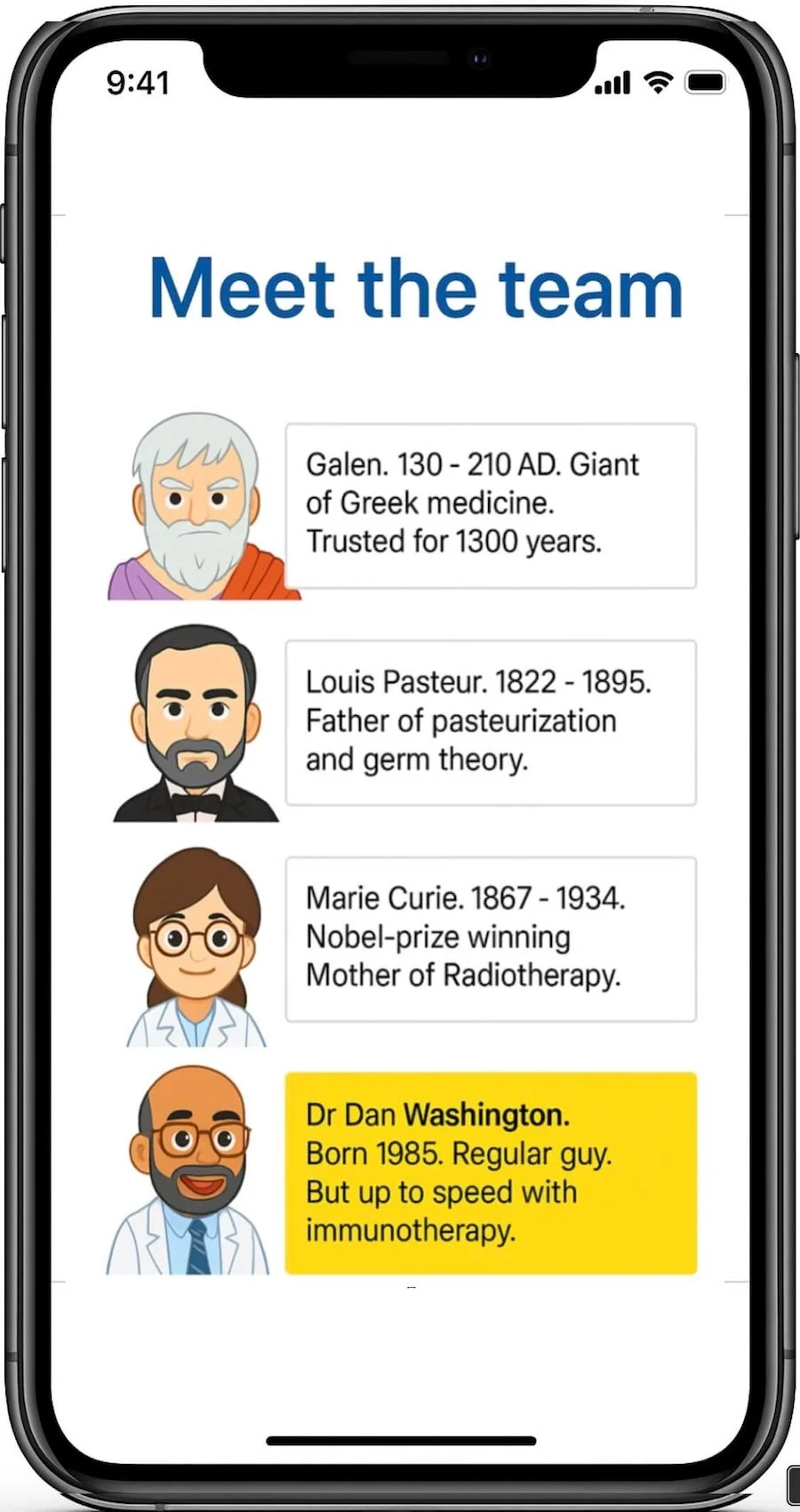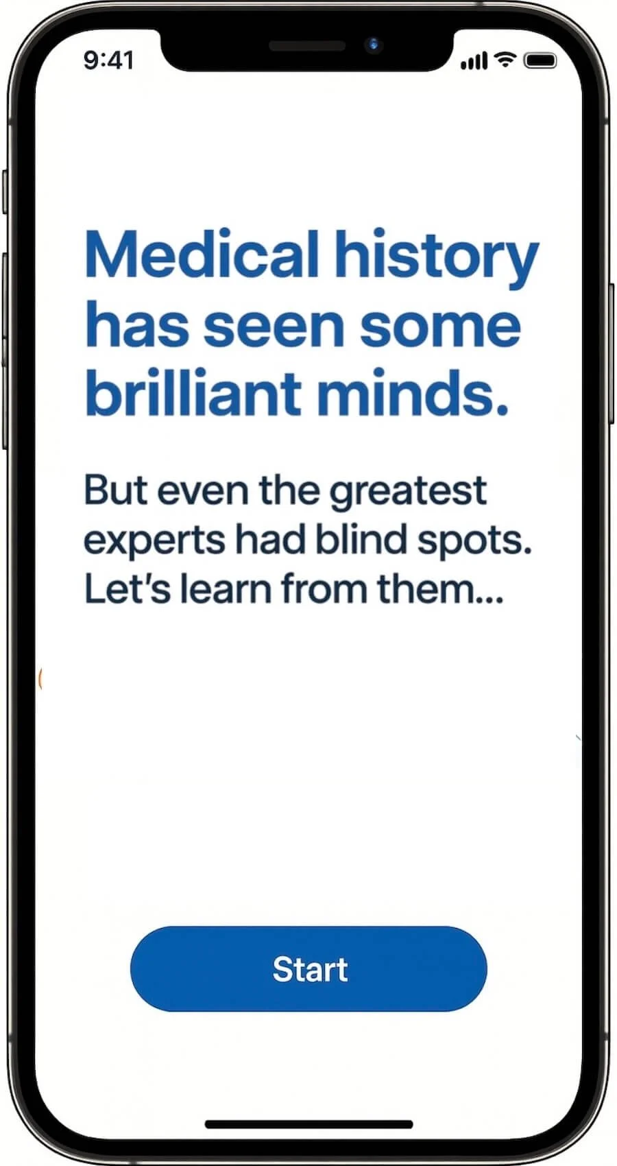 The Solution: By using humor, character psychology, and debate, the app reframes immunotherapy as the logical evolution of medicine — not a radical leap. Instead of lecturing, it invites doctors into a conversation with the experts of the past… and shows why today’s tools are better.