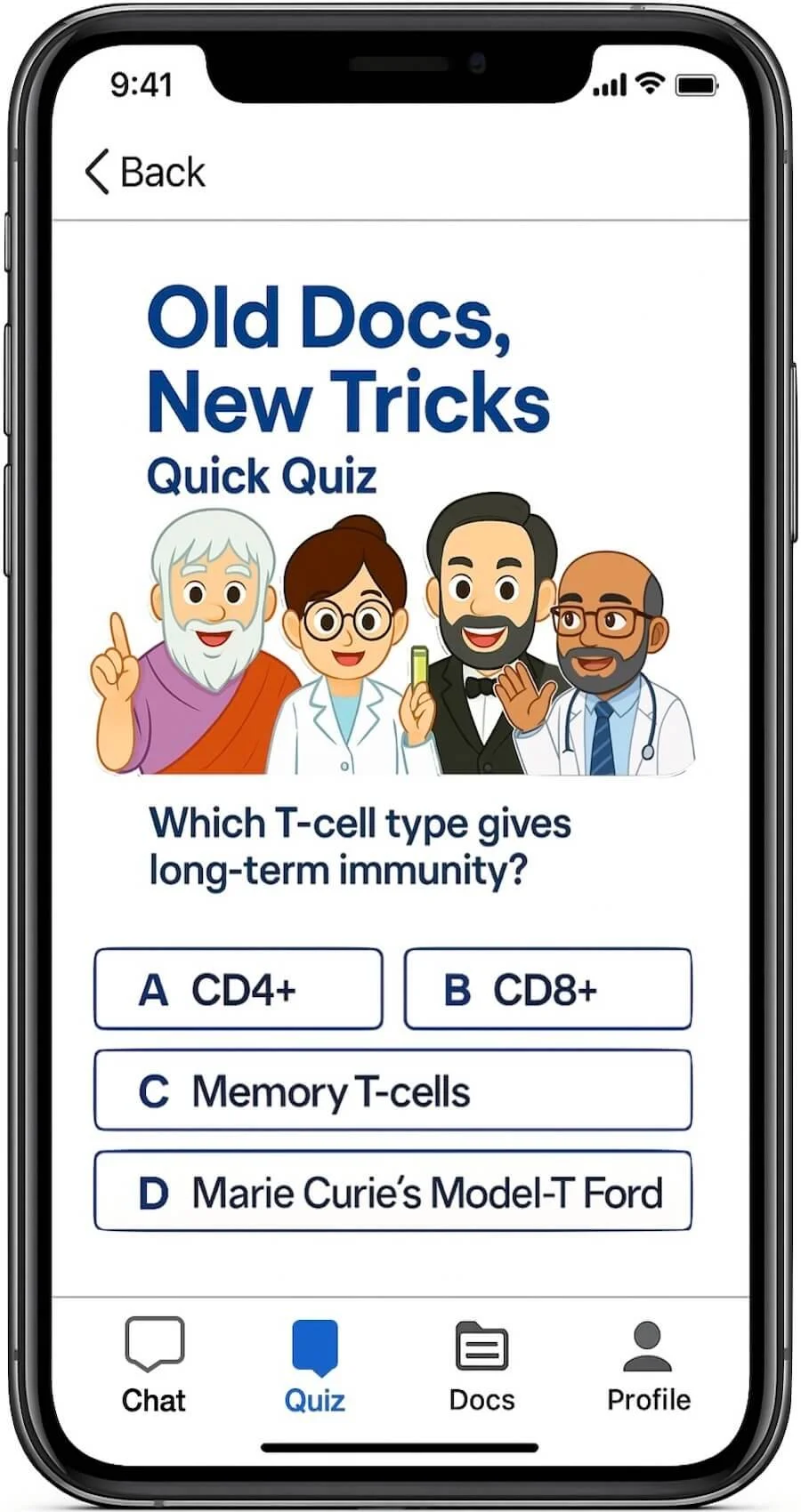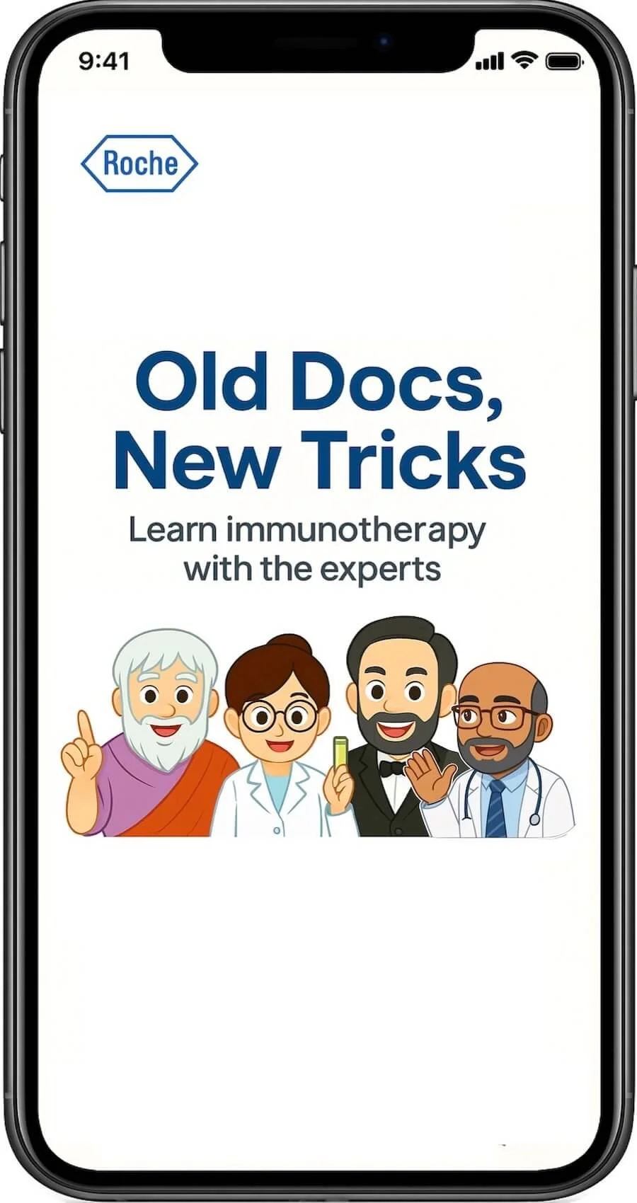 The Concept: “Old Docs, New Tricks” is a humorous medical education app that brings historical physicians to life — Galen, Pasteur, Curie — and lets them debate outdated treatments in real time. Modern doctor Dan Washington acts as the calm voice of reason, introducing immunotherapy as the breakthrough that replaces outdated thinking.