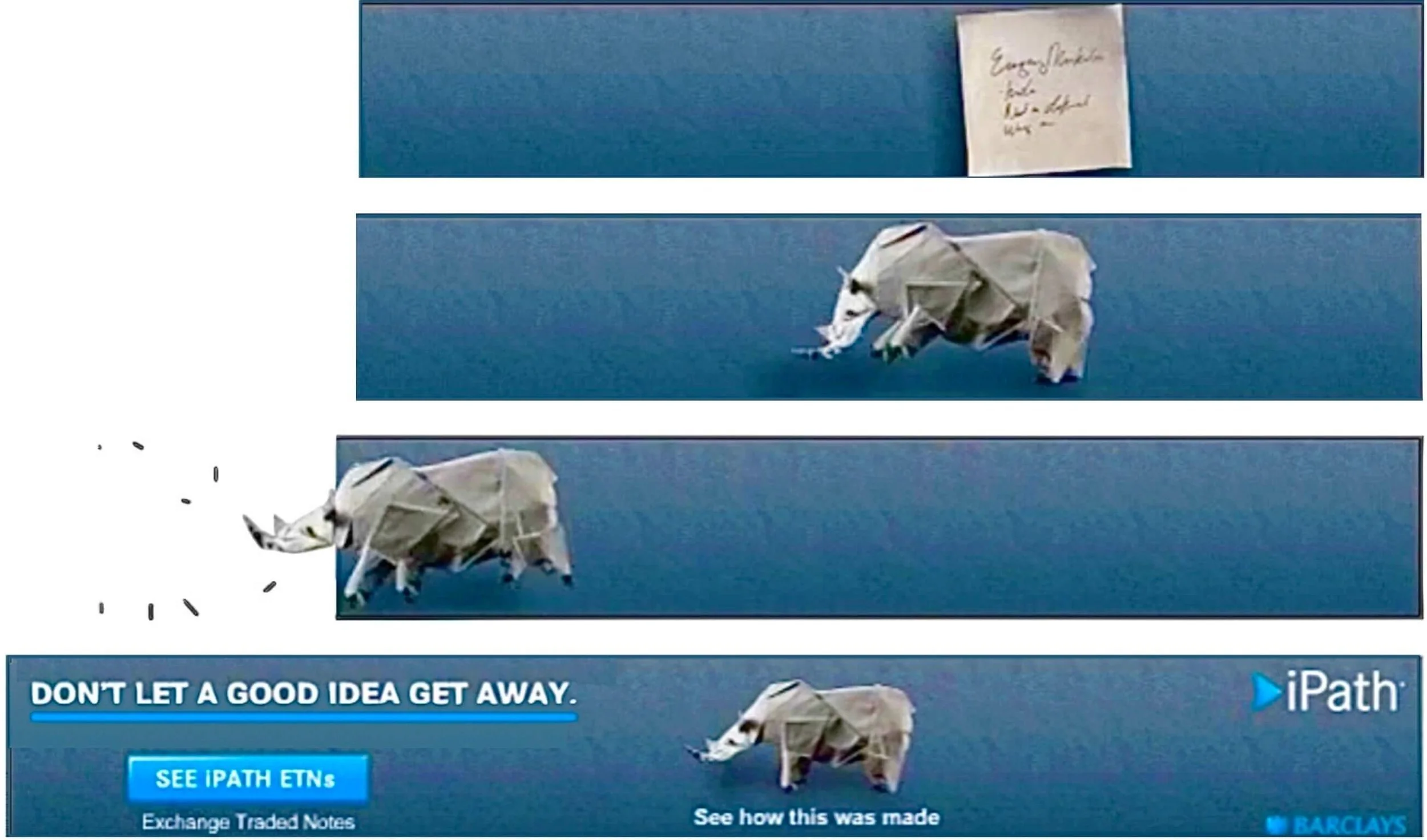 1. Ad begins with a Post It idea that transforms into an origami rhino. 2. Rhino charges the ad border and vanishes into the webpage.